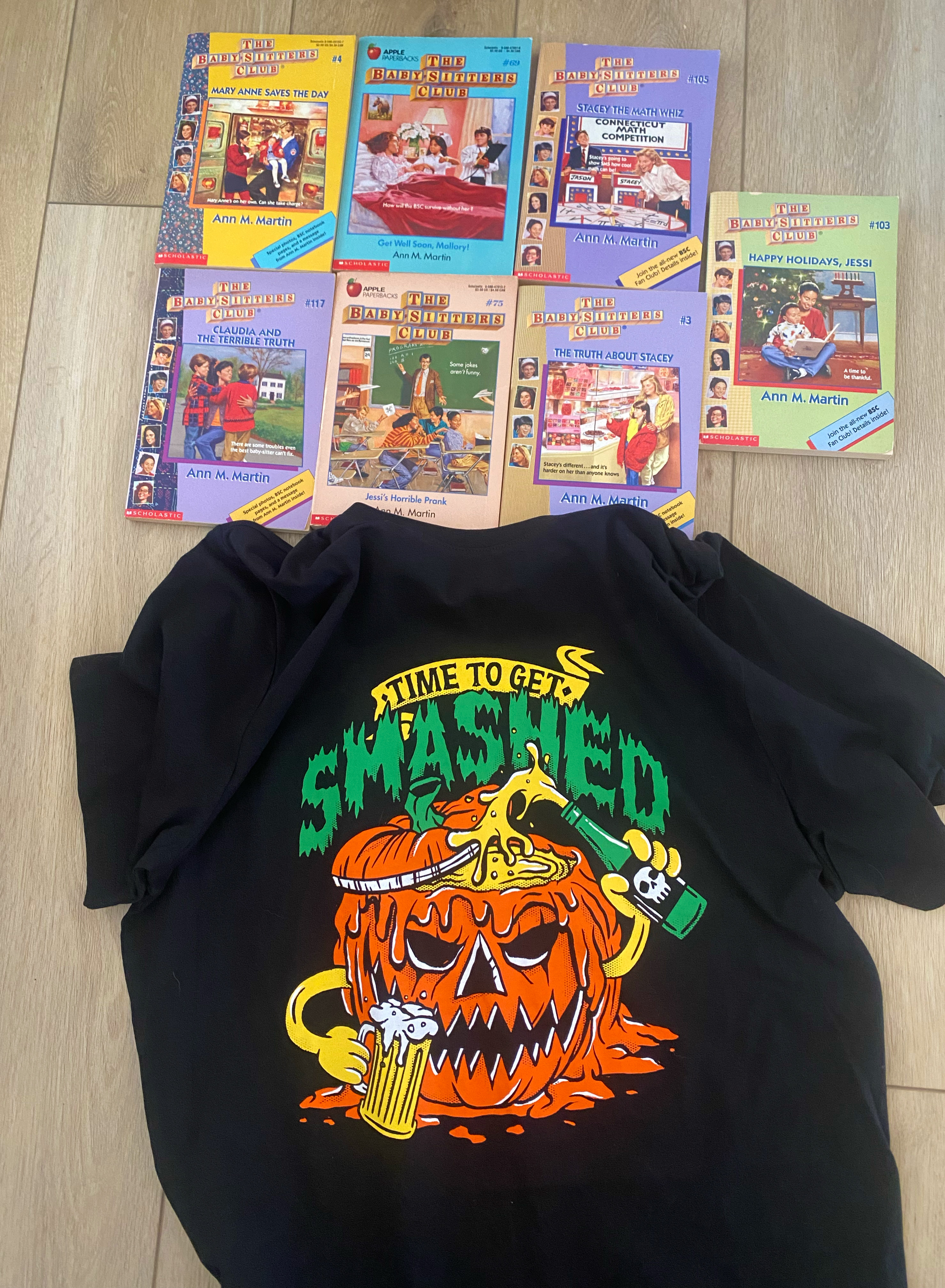 Below are some more things that are making me happy lately – a pile of vintage Babysitters Club books from the 90’s that I found in a charity shop along with the kitschiest, silliest Halloween t-shirt that I’ve been living in.